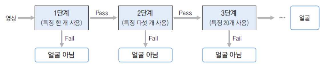 유사-하르 필터(Haar-like filter)집합으로 부터 특징 정보를 추출하여 얼굴 여부를 판단한다.