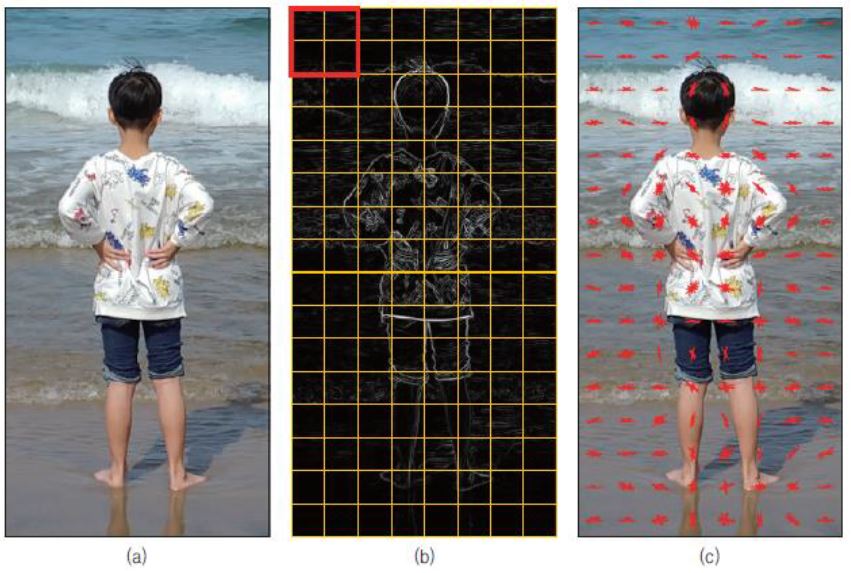 계산한 그래디언트 크기와 방향 성분을 이용하여 사람이 서 있는 형태에 대한 특징 벡터를 정의한다.