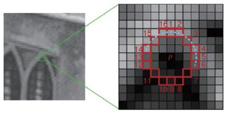 16개의 주변 픽셀과 밝기 값을 비교하여 코너 여부를 판단한다.