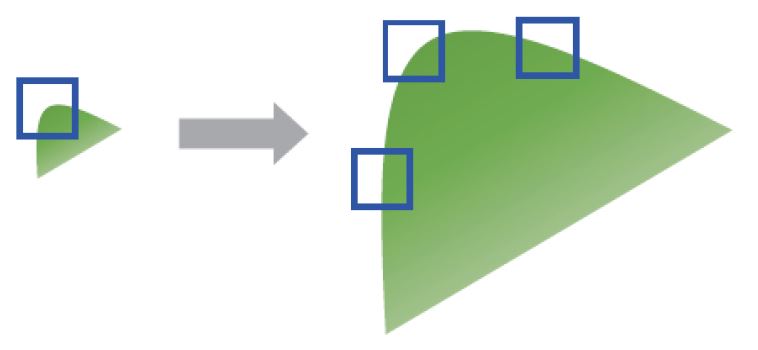 위 그림을 통하여 크기가 다른 두 객체 영상을 코너 점을 이용하여 같은 위치를 판별하는 것에는 한계가 있다.