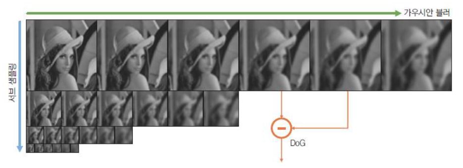SIFT알고리즘에서 크기에 불변한 특징점을 검출할 때, 인접한 가우시안 블러링 영상끼리 차영상을 사용한다.