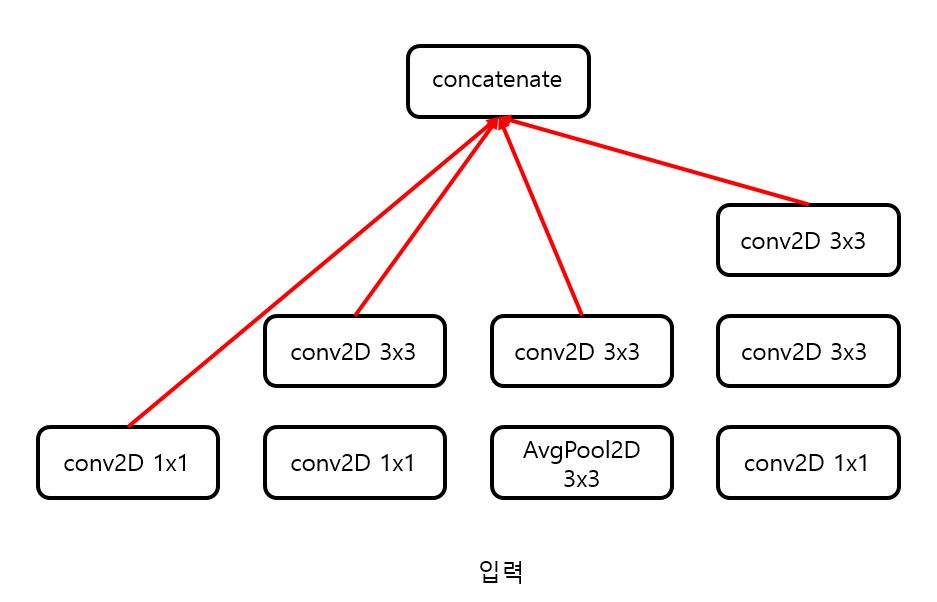 [인셉션 모듈] - 비순환 유향 그래프의 예제. 입력이 나란히 놓인 여러개의 합성곱 층을 거쳐 하나의 텐서로 합쳐진다.