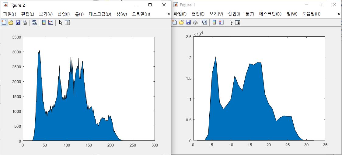 수치적으로 잘 감이 안온다면 그래프로 출력해보시면 확인 할 수 있습니다. 왼쪽은 lena의 일반 histogram 입니다. 왼쪽은 내가 원하는 값으로 bin값을 설정한 후, (밝기 값 * bin 값)을 256로 나누어 해당 비율 값을 확인 할 수 있습니다.