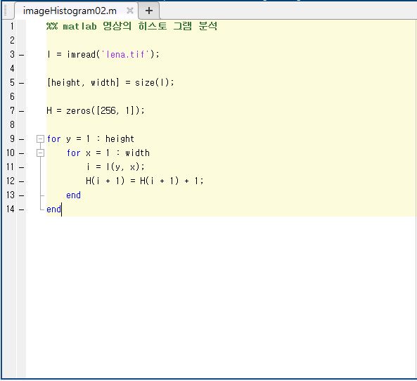 H = zeros([256, 1]) 통하여 그레이 스케일 값의 크기만큼 0 배열을 선언합니다.