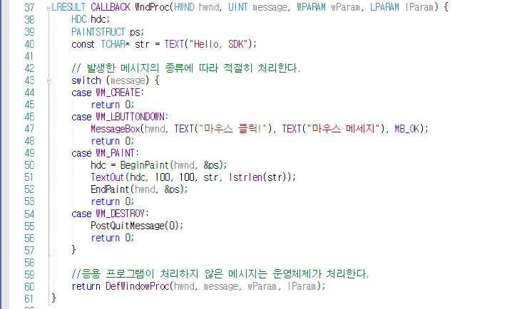 4. 윈도우 프로시저에서 메시지를 처리한다.
