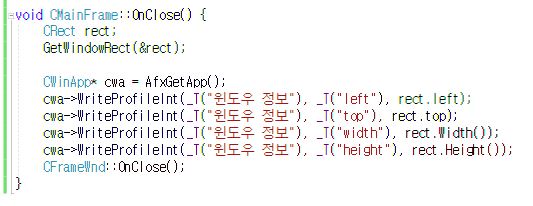 CMainFrame::PreCreateWindow(CREATESTRUCT& cs)에 CWinApp::GetProfileInt() 함수를 통해 레지스트 값을 가져온다.