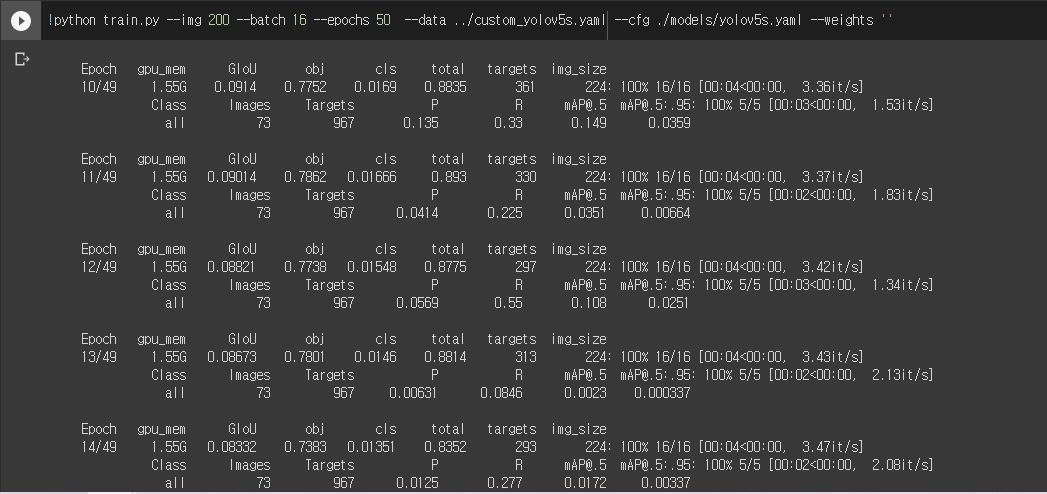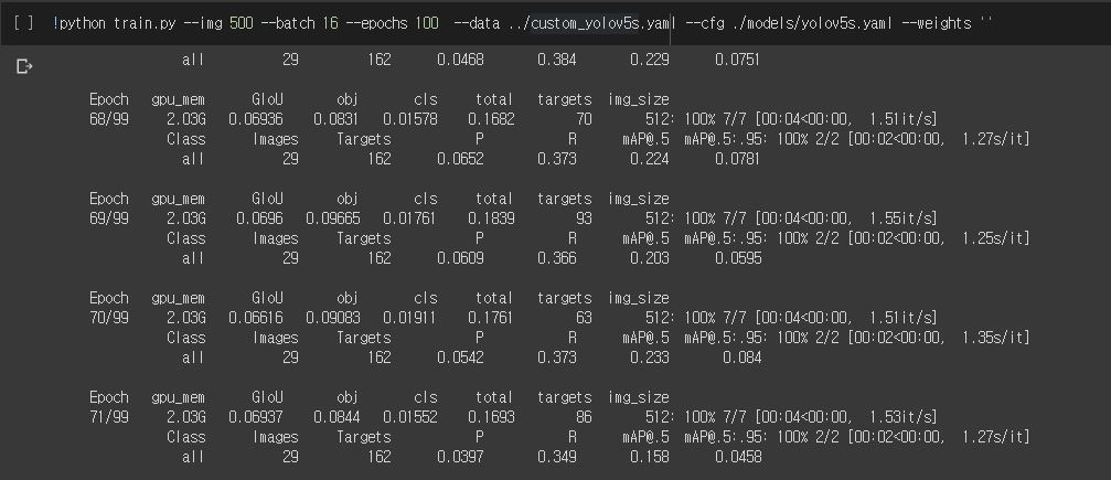!python 명령어를 통해 train.py 파일을 실행하고 data와 cfg 모델 선택을 한 후, 학습을 진행합니다.