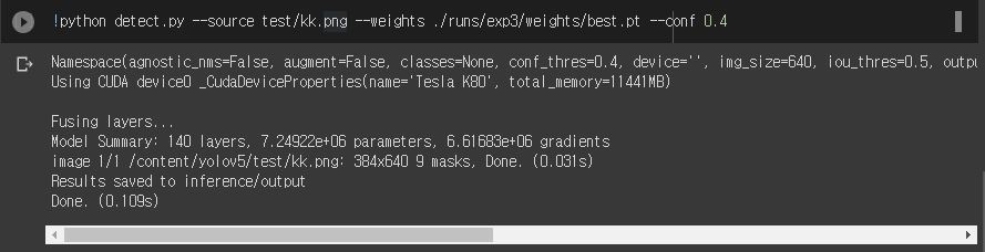 source에 아까 업로드한 파일의 디렉토릴를 설정하고 weight을 설정할 때 가장 최근에 사용한 exp파일의 weight을 설정합니다. 디렉토리 확인 중요합니다. 그다음 신뢰값 0.4정도로 하고 실행하겠습니다.