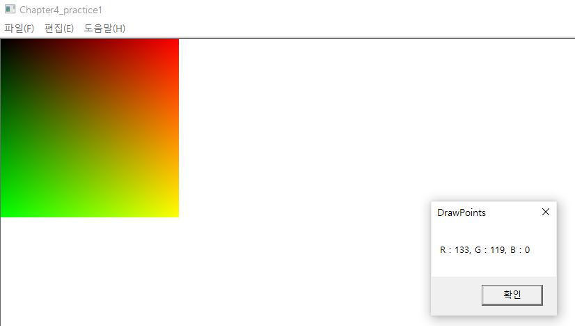 9. DrawPoints 예제를 마우스 왼쪽 버튼을 누르면 해당 좌표에 대응하는 색상 값을 다음과 같이 메시지 상조로 출력하도록 수정하시오.