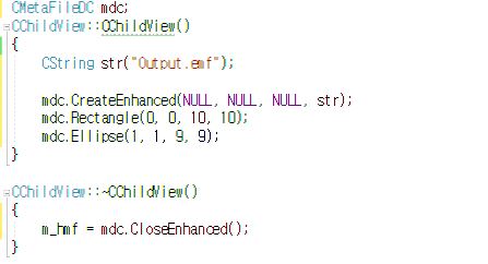 CList<CRect, RECT&> Clist; 를 전역으로 설정하고 CChildView::CChildView() 생성자에 CMetaFileDC을 만든다.