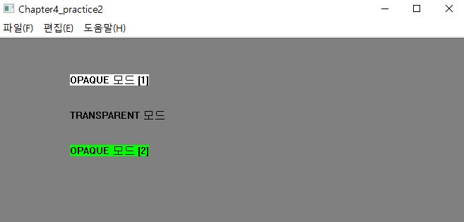 17. BackgroundMode 예제를 수정하여, 마우스 왼쪽 버튼을 누르면 배경 모드가 불투명(OPAQUE), 마우스 오른쪽 버튼을 누르면 배경 모드가 투명(TRANSPARENT)으로 전환되도록 하시오. 단, 기본 배경 모드는 투명이다.