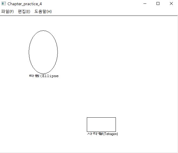 21. StockObjects 예제를 수정하여, 'DEVICE_DERAULT_FONT' 내장 폰트를 설정하여 타원 위에 '타원(Ellipse)', 'SYSTEM_FIXED_FONT' 내장 폰트를 사용하여 사각형 위에 '사각형(Tetragon)' 글자를 출력하도록 수정하시오.