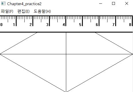 11번 문제처럼 GetClientRect(&rect)와 MoveTo(), LineTo() 함수를 사용하여, POINT points[] = { } 로 dc.Polyine() 이용해 마름모를 그려줍니다.