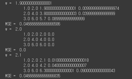 실행 결과를 보면 w = 2.0 인 경우 MSE 값이 0으로 이상적인 것을 알 수 있습니다.