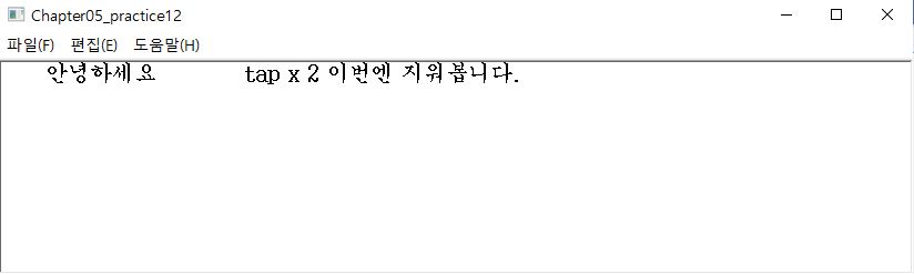 23. InputCharacter 예제를 수정하여 TAB을 입력할 때 공백이 4칸 입력되도록 수정하시오. 단, Back space를 누르면 공백 4칸은 한꺼번에 삭제되도록 한다.
