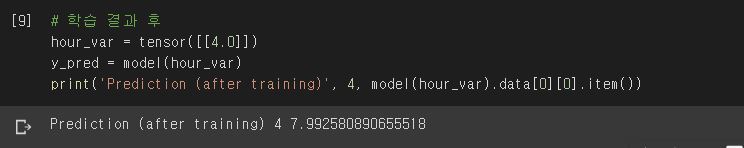 print('Prediction (after training)', 4, model(hour_var).data[0][0].item())