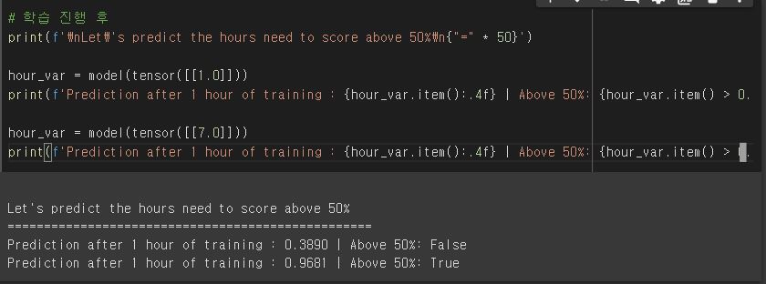 # 이제 hour_var 값을 우리가 학습한 모델에 대입합니다. 결과 값이 0.5 이상이면 True를 출력하고 0.5 미만이면 False를 출력합니다.