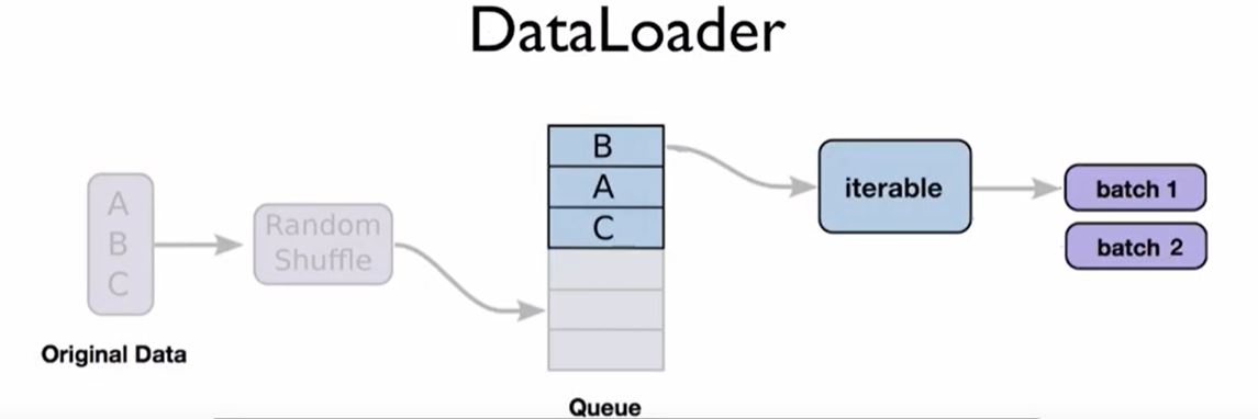 시퀀스적으로 보면 해당 데이터가 들어오면 셔플 적용여부를 선택하고 큐에 데이터가 들어갑니다. 그 다음 각각 큐에 존재하는 데이터에 대하여 반복을 진행합니다. 하지만 데이터 로더를 사용하면 Queue까지 스스로 구현이 되기 때문에 우리는 반복에 대한 부분만 처리해주면 됩니다.