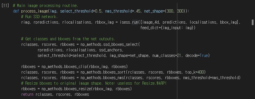 이미지가 들어오면 SSD 모델을 동작하고 Bounding box를 처리하기 위한 이미지 처리함수를 제작합니다.
