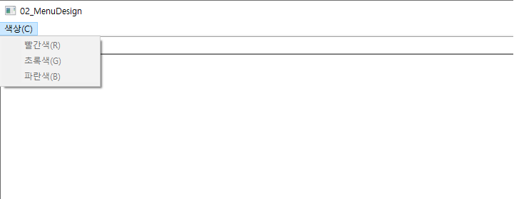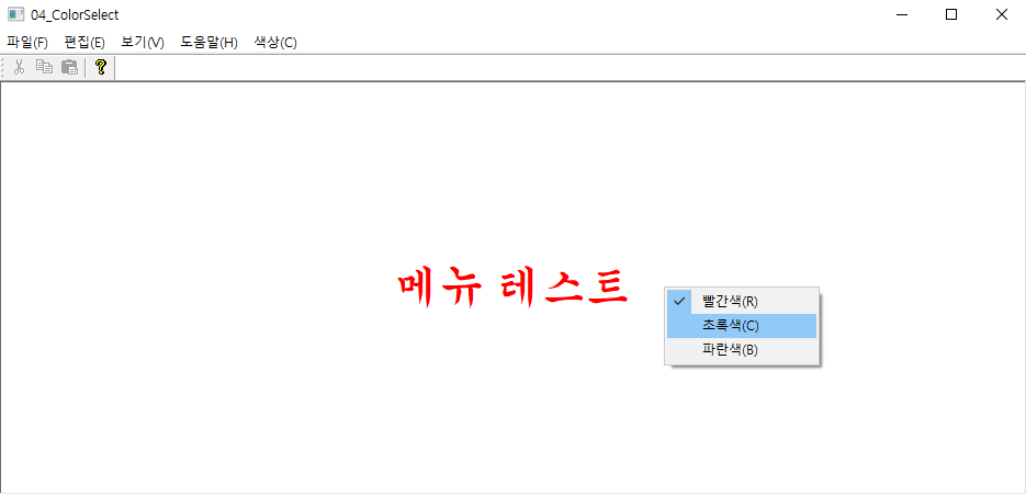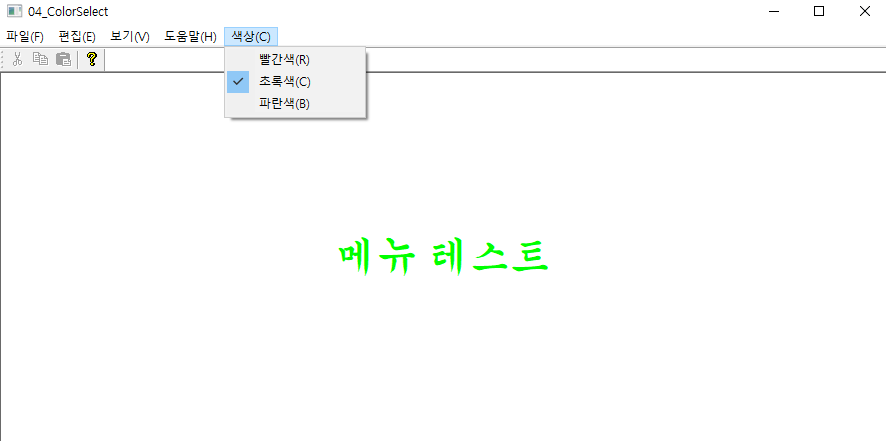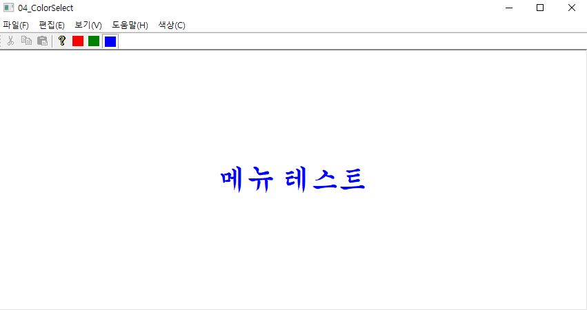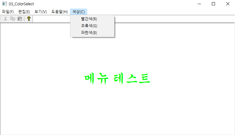 빨간색, 초록색, 파란색 세가지 색상 중 하나를 메뉴에서 선택하면 클라이언트 영역에 출력된 텍스트 색상이 바뀐다.