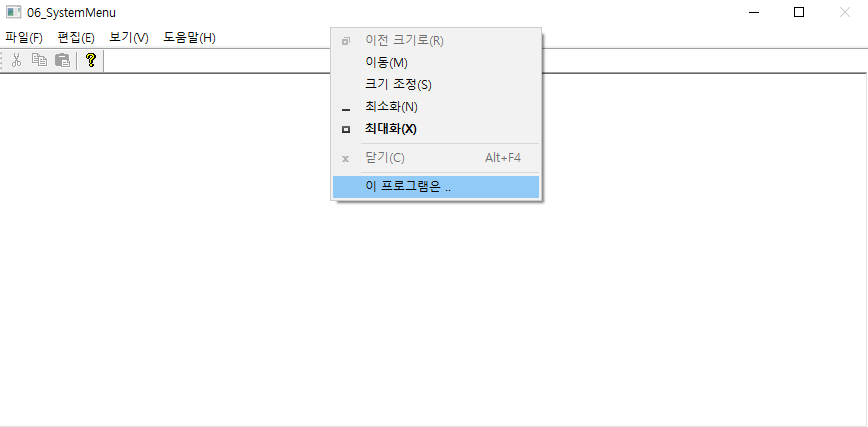 시스템 메뉴는 윈도우의 좌상단에 있는 아이콘을 클릭하거나, 타이틀 바에서 마우스 오른쪽 버튼을 클릭할 때 표시되는 메뉴로, 윈도우 조작과 관련된 몇가지 기능을 기본적으로 제공한다.
