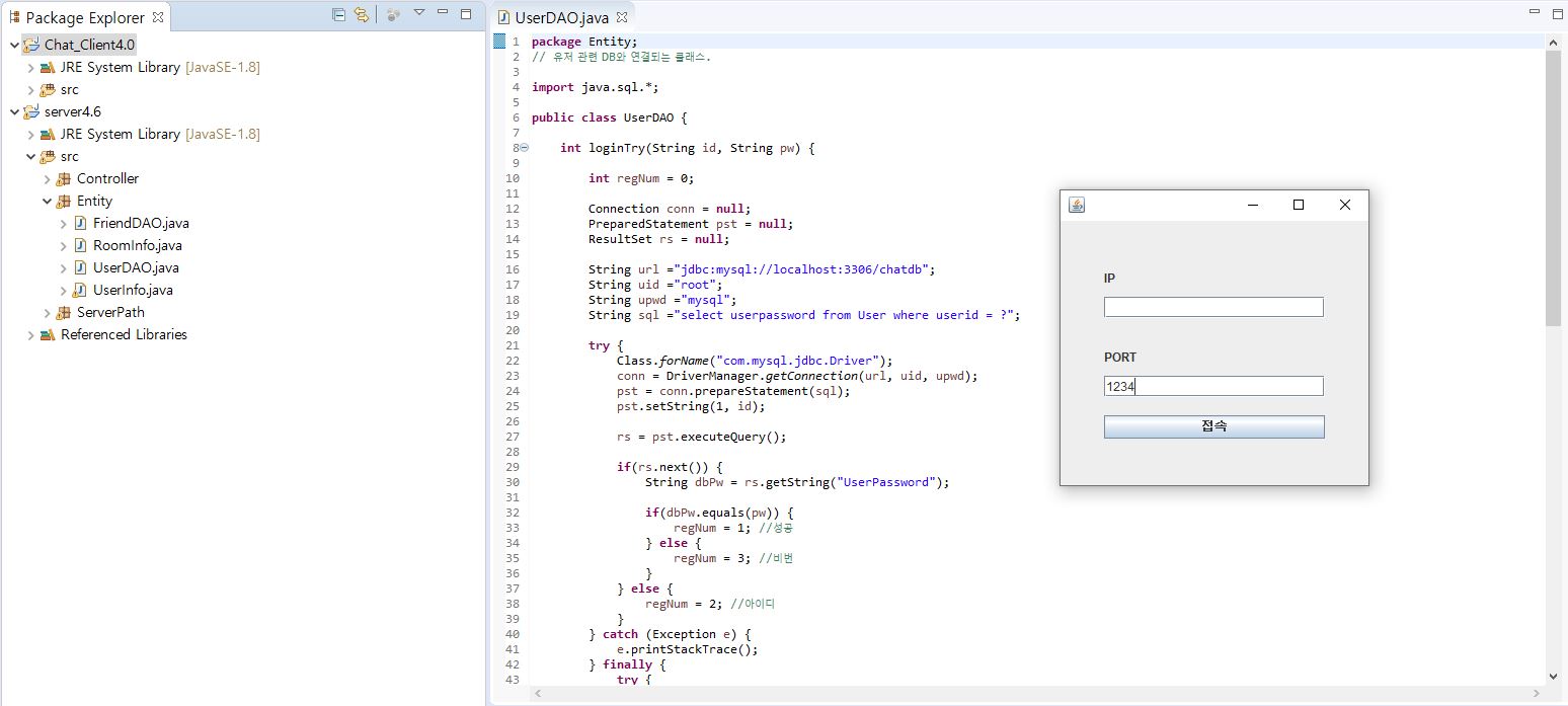 Client Side를 실행 시키면 서버의 IP번호와 Port 번호를 가지고 접속할 수 있는 GUI창이 생성됩니다.