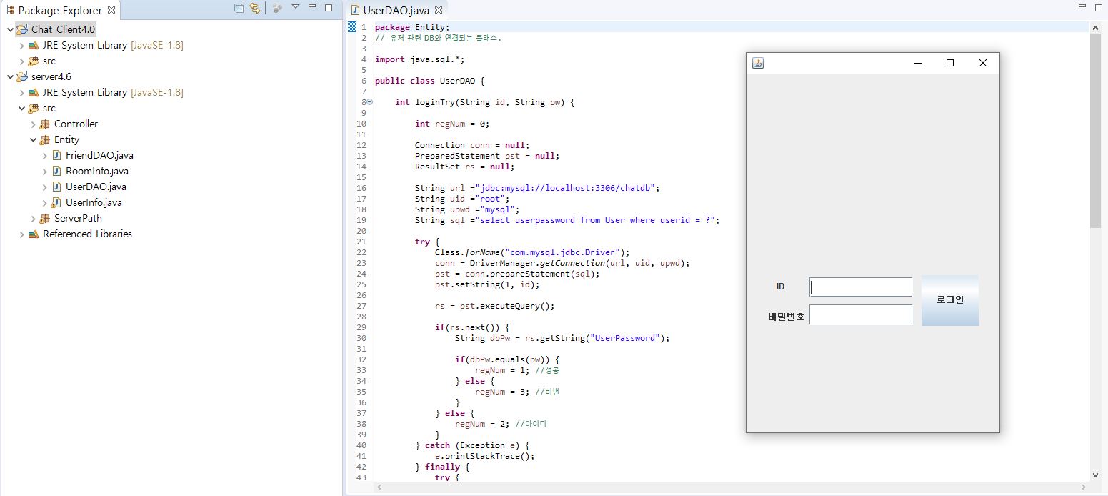 정상적인 연결이 되면 데이터 베이스에 제작해 놓은 id와 pw가지고 로그인을 할 수 있는 창이 생성됩니다.