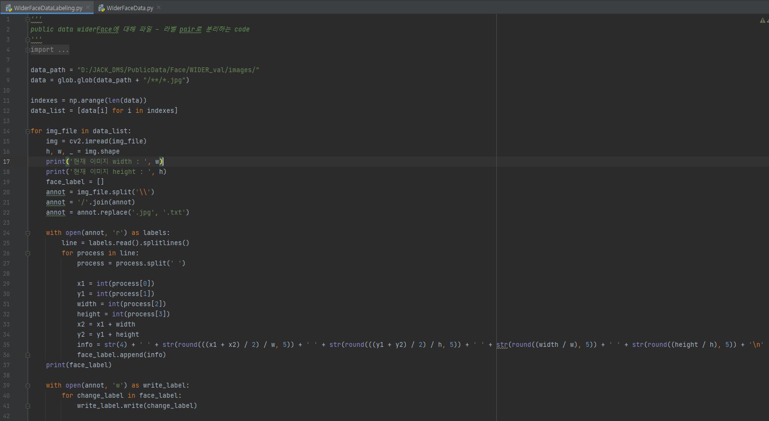 해당 코드는 Annotation 파일을 읽어서 JPG 파일 밑에 TXT 파일을 생성하는 코드입니다.