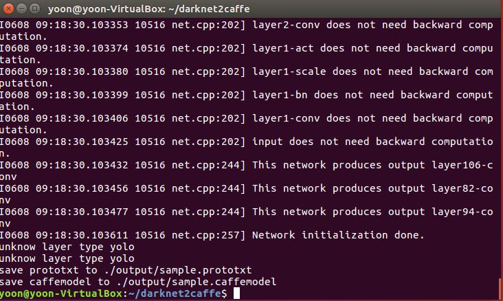 2가지 파일을 darknet2caffe.py의 input으로 넣어야합니다. 그렇게 python darknet2caffe.py 파일을 실행하면 converting이 진행되는 것을 확인할 수 있습니다.