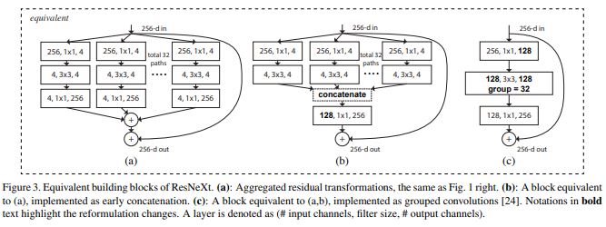 C는 통합되기 위한 Transformation 집합의 수가 된다. 즉Cardinarity이다. Cardinarity의 Dimension은 Transformation의 수를 관리할 수 있으며,Width와Depth의 Dimension 보다 효과적이고 필수적이라는 것을 증명했다.- Inception 및 Inception-ResNet Module과 달리 Multiple Path에 대해 같은 Topology 공유한다. 저자의 Module은 약간의 노력으로 각 Path들을 생성할 수 있다.