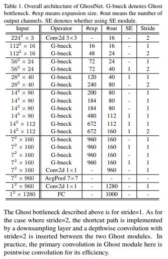 stride=1적용한다. 각 stage 마지막에만stride=2적용한다. squeeze and excite(SE)module 또한 Ghost bottleneck의 Residual Layer에 적용한다.
