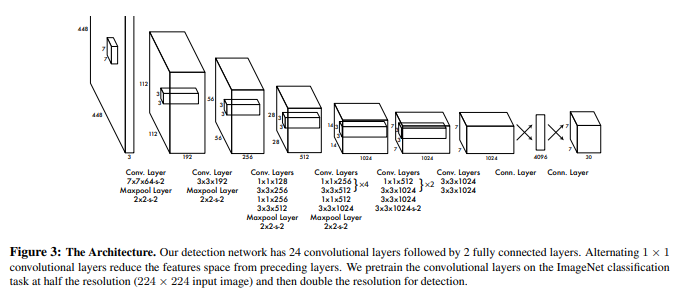 convolution layer는 image에서 feature 추출하는 역할을 한다. 반면fully connected layer는 output probability와 coordinate 예측한다. - network 구조는 image classfication에서 사용했던 GoogLeNet에서 영감을 받았다. 24개의 convolutional layer와 2개의 fully connected layer 구성되어 있다.