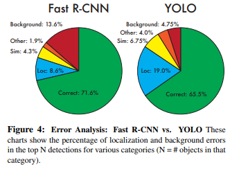 mean average precision (mAP)갖는다. - YOLO는 predict 진행할 때, image 전체적인 부분을 합리화 한다. Fast R-CNN 경우 큰 맥락을 보지 못하기 때문에 이미지 안에서 객체를 background 부터 분리 시키지 못한다. YOLO는 이와 비교해서 적은 background error 만든다.
