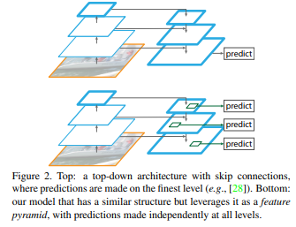 multi-scale pyramidal hierarchy활용하여 비용 측면을 고려한 feature pyramids 설계한다. top-down구조는 문자 그대로 모든 크기에서 높은 단계의 semantic feature maps 연결을 설계하는 방법이다. 이러한 구조는 Feature Pyramid Network(FPN) 불리며 여러 application 안의 feature extractor에서 중요한 향상을 가져온다.