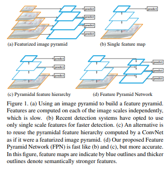 - 논문의 목적은 ConvNet’s feature 사용하여 다양한 크기에 대한 feature pyramid 만드는 것이다. 이는 low-resolution과 high-resolution 결합하는 구조에 있다. Figure 1-(d) 참조.