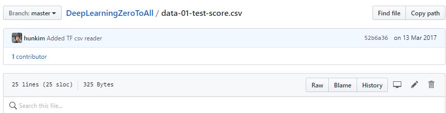 김성훈 교수님 github에 들어가 csv파일을 선택하고, Raw버튼을 누르면 데이터를 복사할 수 있게 생성이된다.