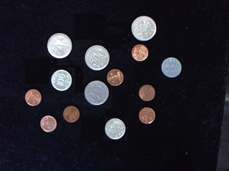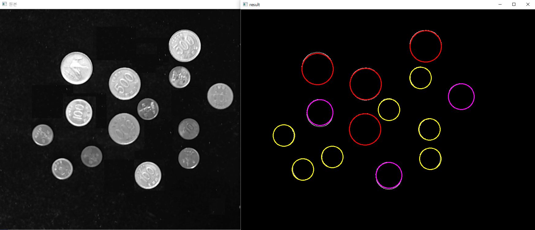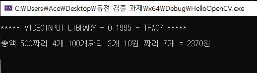 영상을 읽어와 동전별로 검출한 후, 값을 결과로 출력하는 프로그램