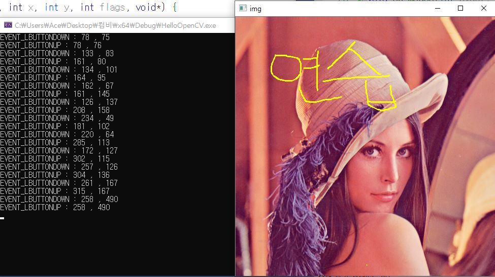 MouseCallback 인자에 마우스 작동 함수를 구현한다.