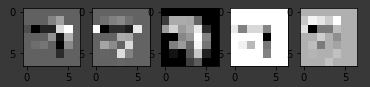 plt.subplot(1, 5, i + 1), plt.imshow(one_img.reshape(7, 7), cmap = 'gray')
