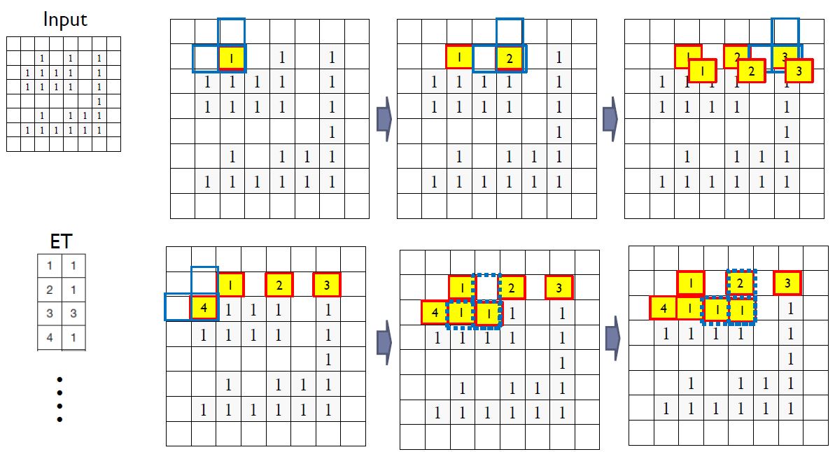 등가 테이블(equivalent table)을 만들면서 영상을 두번 스캔 함으로써 레이블링을 수행
