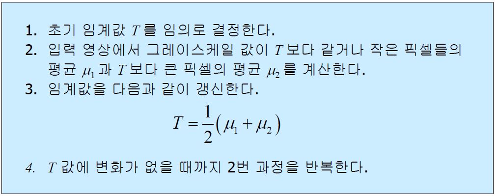 반복적 방법을 통하여 이진화 임계값을 결정한다.