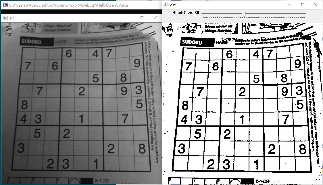 void adaptiveThreshold(InputArray src, OutputArray dst, double maxValue, int adaptiveMethod,
